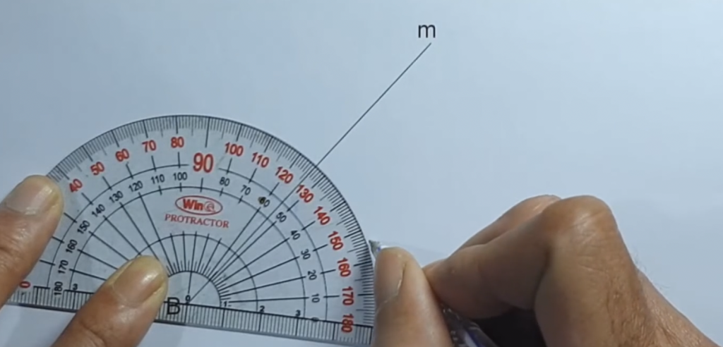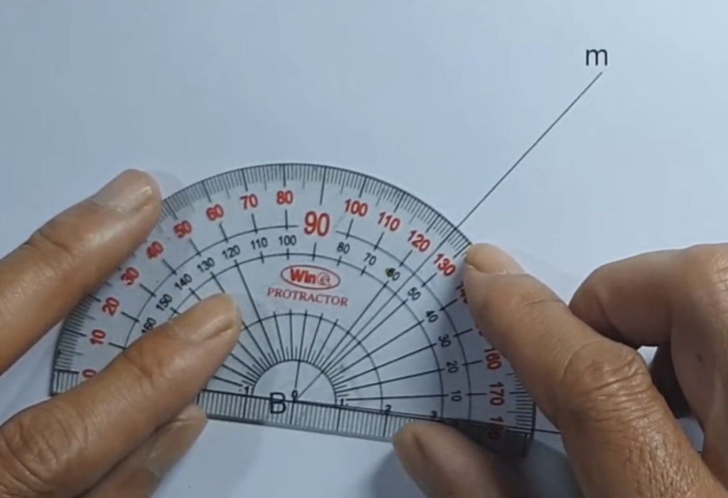 Chúng ta đặt thước đo góc có điểm 0 trùng với 1 trong 2 cạnh của góc, ở đây mình sẽ chọn điểm 0 của thước trùng với cạnh Bn